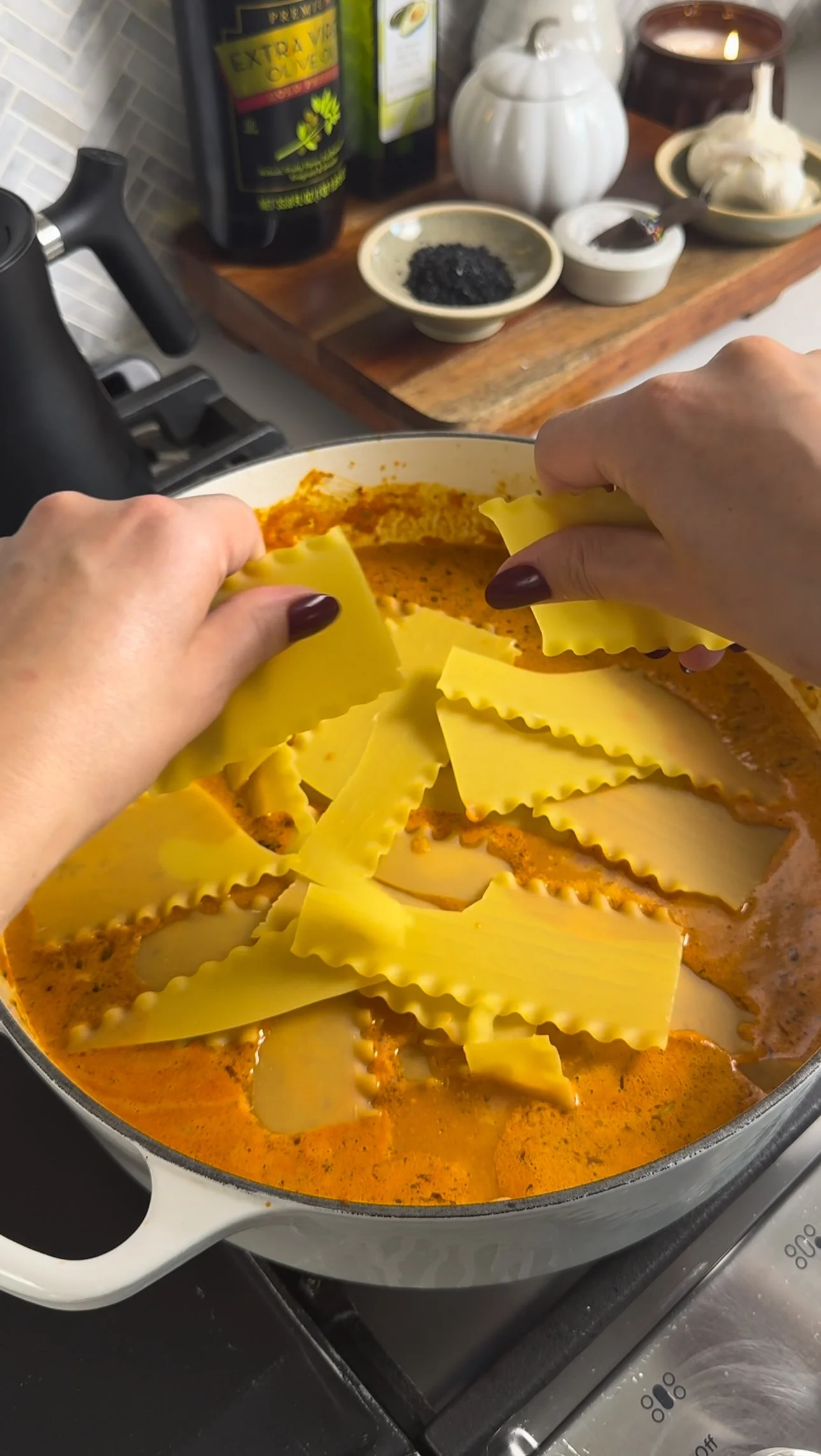 4. Pour in the creamy squash-pepper sauce and the beef broth. Stir well, then add the broken lasagna sheets. Simmer until the pasta is al dente, about 10–15 minutes.