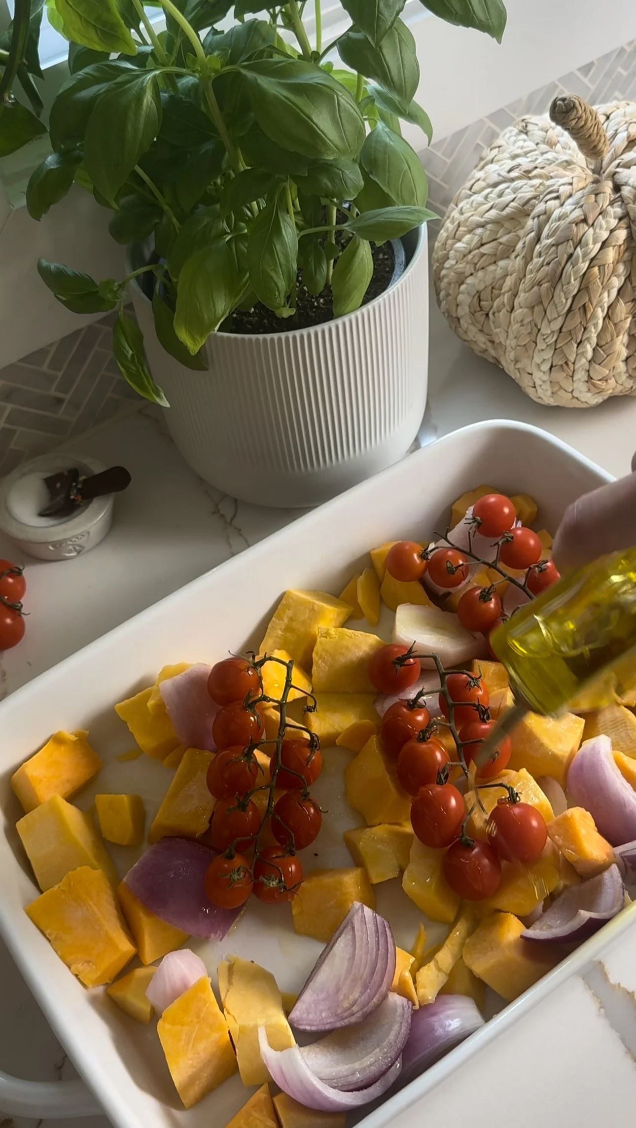 2. Add the cubed butternut squash, red onion, and cherry tomatoes to a baking sheet. Drizzle with olive oil, season with salt and pepper, and toss to coat.