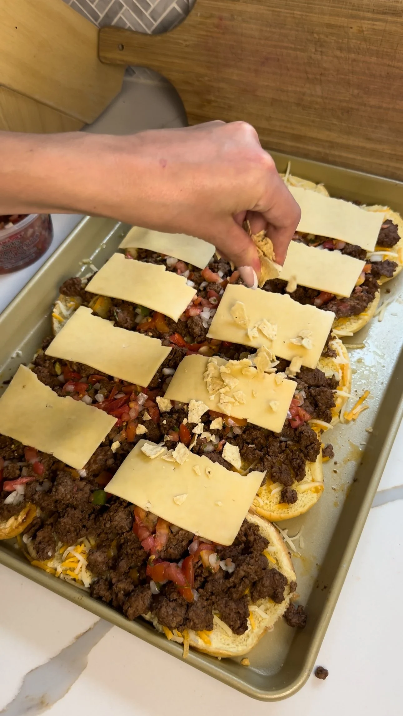3. Spoon the seasoned beef evenly over the bun bottoms. Top with salsa, sliced cheese, crushed tortilla chips, and the remaining shredded cheese.