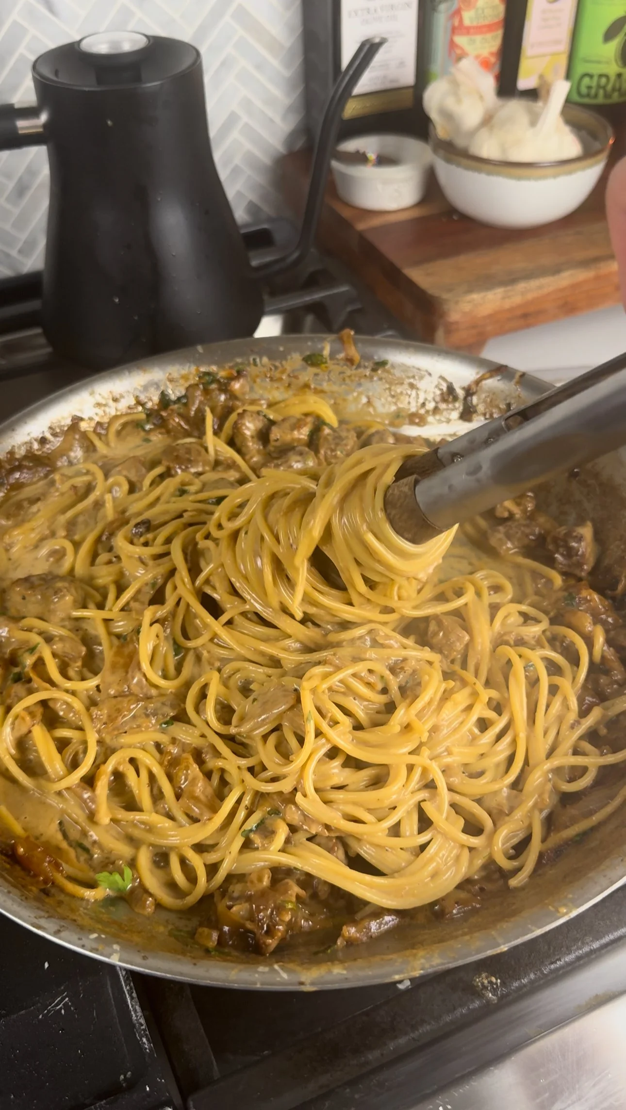 If you need a really dramatic pasta dish then make this! Caramelized onions + steak bites + white wine sauce + spaghetti ✨ . Hardest part about this dish is babysitting the onions while they caramelize, otherwise it’s super easy to make and the taste is 10/10 ⭐️